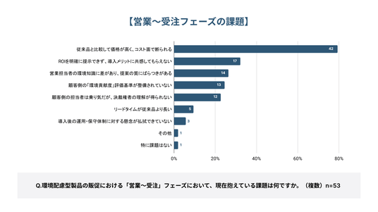 「営業~受注フェーズでの課題は何か」という設問に対し、最も選択されたのは「従来品と比較して価格が高く、コスト面で断られる(79.2%)」となり、約8割の担当者が課題と感じていることがわかった。次いで、「ROIを明確に提示できず、導入メリットに共感してもらえない(32.1%)」、「営業担当者の環境知識に差があり、提案の質にばらつきがある(26.4%)」が続いた。また、「顧客側の『環境貢献度』評価基準が整備されていない(24.5%)」、「顧客の現場担当者は乗り気だが、決裁権者の理解が得られない(22.6%)」という回答も約5名に1名が選択した。