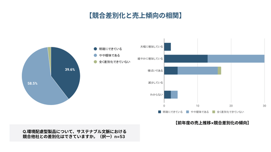 「環境配慮型製品について、サステナブル文脈において競合他社との差別化は明確にできているか」という問いに対して、「明確にできている」との回答は39.6%であり、「やや曖昧である」との回答は58.5%だった。なお、「全く差別化できていない」との回答は1.9%(1名)のみだった。また前年度比の売上推移の結果と照らし合わせると、競合他社との差別化が明確にできているほど、売上が増加する傾向が推察できる。