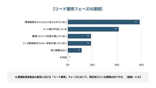 「リード獲得フェーズでの課題は何か」という設問に対し、最も選択されたのは「環境価値をメリットとして伝えられていない(58.5%)」となった。次いで、「リード数が不足している(41.5%)」、「獲得したリードの質(ターゲット層)が適していない(18.9%)」、「リード獲得後のフォロー体制が整っていない(18.9%)」が続いた。