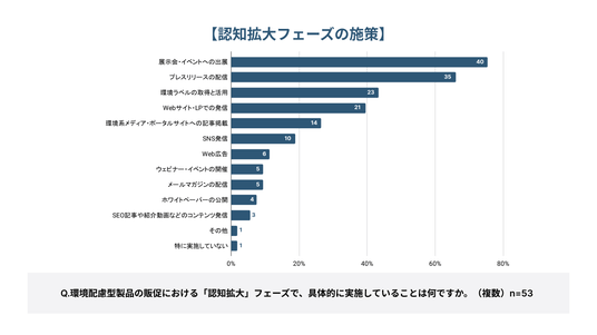「認知拡大フェーズにおいて、具体的に実施していることは何か」という設問に対し、最も選択されたのは「展示会・イベントへの出展(75.5%)」、次いで「プレスリリースの配信(66.0%)」という結果になった。続いて「環境ラベルの取得と活用(43.4%)」や「Webサイト・LPでの発信(39.6%)」が選ばれた。一方で、Web広告(11.3%)やウェビナー(9.4%)、メルマガの配信(9.4%)をはじめ、ホワイトペーパー、SEO記事、動画などのコンテンツ発信にまつわるデジタル施策は、総じて低い実施率に留まっている。この結果から、認知拡大の手法として「展示会」や「プレスリリース」などの単発施策は実施されているが、デジタル上のマーケティング施策は展開余地を残す結果となった。施策を組み合わせることで、環境価値という複雑なメッセージをより深く、広く浸透させることができる可能性がある。