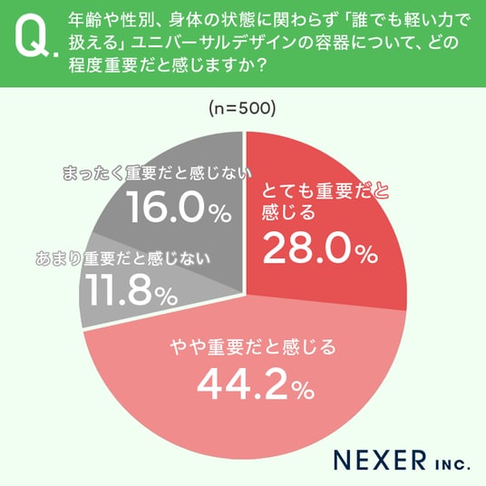 続いて、年齢や性別、身体の状態に関わらず「誰でも軽い力で扱える」ユニバーサルデザインの容器について、どの程度重要だと感じるかを聞いてみました。