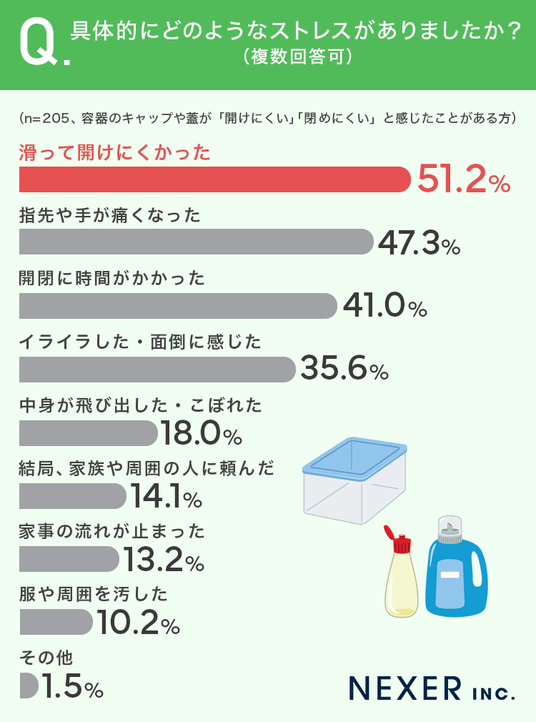 ■容器の開閉時のストレス、最多は「滑って開けにくかった」で51.2%