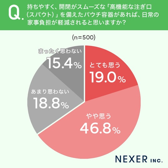 最後に、持ちやすく開閉がスムーズな「高機能な注ぎ口(スパウト)」を備えたパウチ容器があれば、日常の家事負担が軽減されると思うかを聞いてみました。