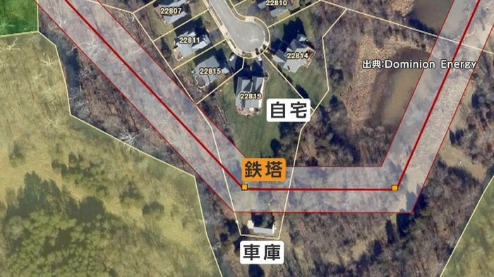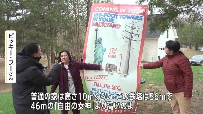 この地域に住むビッキー・フーさんは、膨大な電力を使うデータセンターのために、自宅の裏庭に高圧送電線の鉄塔を建てる計画があると明かす。
