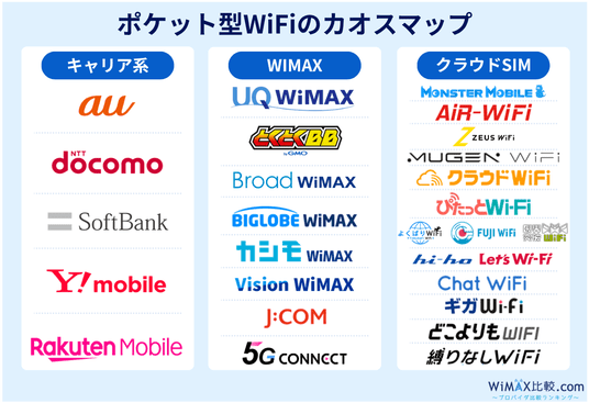 本カオスマップでは、現在のポケット型WiFi市場を「キャリア系」「WiMAX」「クラウドSIM」の3系統に整理したうえで、主要サービスの構造を可視化しています。これにより、ユーザーは「どのポケット型WiFiを選ぶか」だけでなく、「どの系統のサービスなのか」「各系統でどのような特徴や違いがあるのか」まで一目で把握できるようになります。