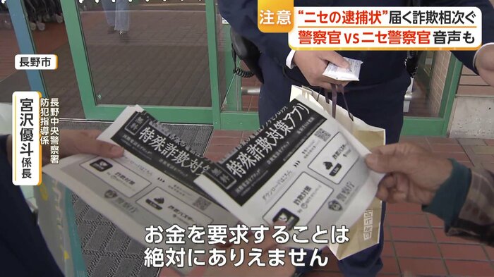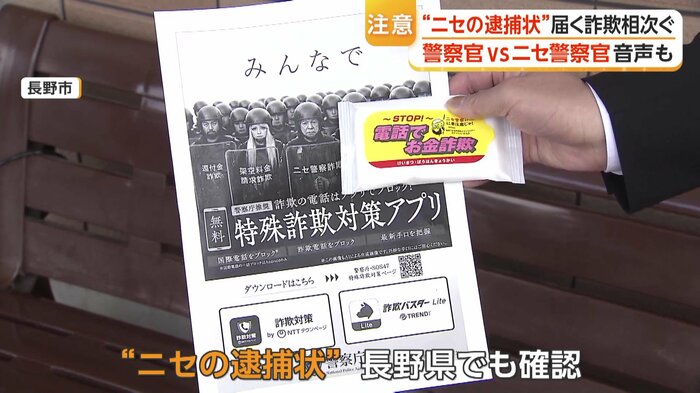 ニセの逮捕状が自宅に郵送される手口は、長野県でも確認されていて、警察はビラを配るなどして、特殊詐欺への警戒を呼びかけている。