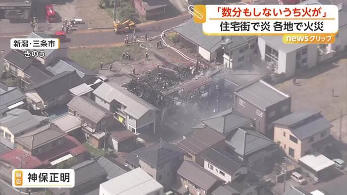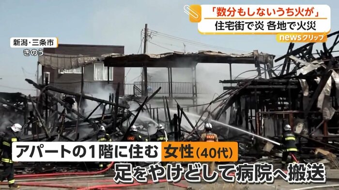 新潟・三条市で21日、2階建てアパートで火事があり、40代の女性が足をやけどして搬送された。島根・松江市でも同日、バイク店を兼ねる住宅が出火し全焼した。