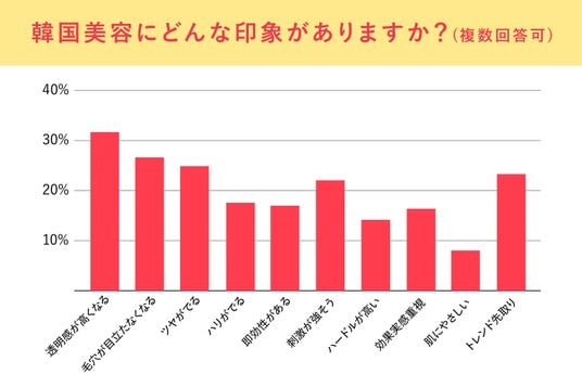 さらに、「韓国美容にどんな印象がありますか」という設問では、「透明感が高くなる」が31.8%で最多となり、次いで「毛穴が目立たなくなる」が26.7%、「ツヤがでる」が25.0%、「トレンド先取り」が23.3%という結果でした。
