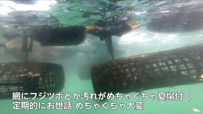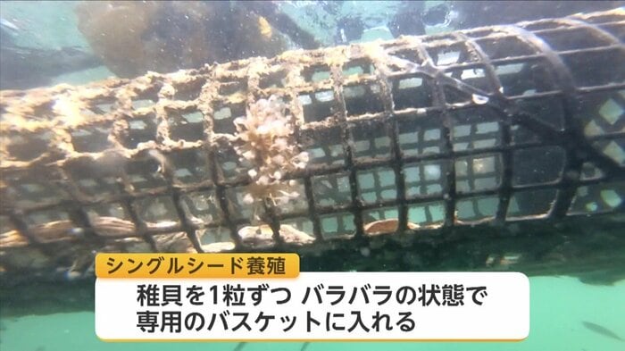 しかし、境田さんは去年から試験的に稚貝を1粒ずつバラバラの状態で専用のバスケットに入れる「シングルシード養殖」を始めた。