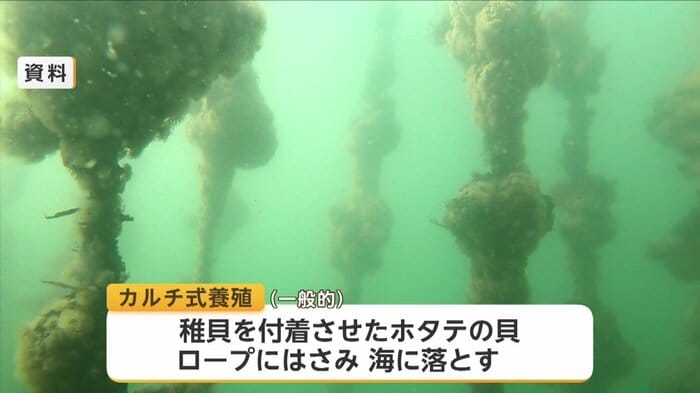有明海のカキの養殖は、稚貝を付着させたホタテの貝をロープにはさみ海に落とす「カルチ式」が一般的だ。