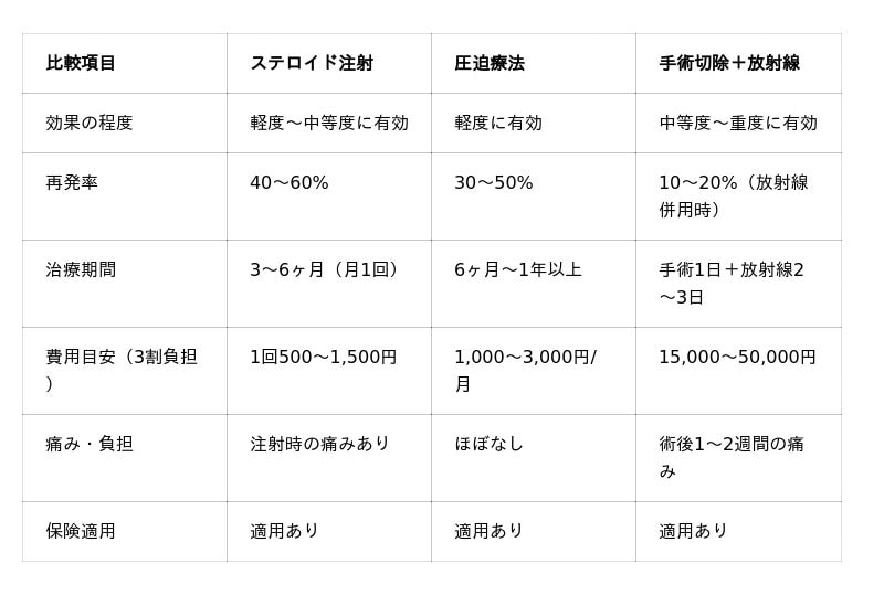 本調査では、手術切除と放射線療法併用の満足度が82.4%で最も高く、ステロイド注射単独の58.3%を大きく上回りました。手術単独では再発率50~100%と高いですが、放射線療法を併用することで10~20%程度に抑制できます。ただし、軽度の症例ではステロイド注射や圧迫療法から開始し、反応を見ながら治療法を選択することが基本です。