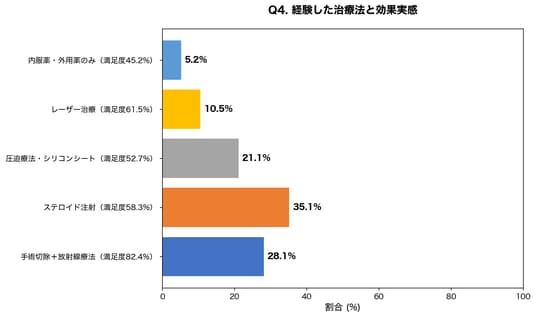 ステロイド注射が最も多く選択されていますが、満足度では手術切除と放射線療法の併用が突出しています。中等度~重度のケロイドには積極的な治療介入が有効であることを示しています。