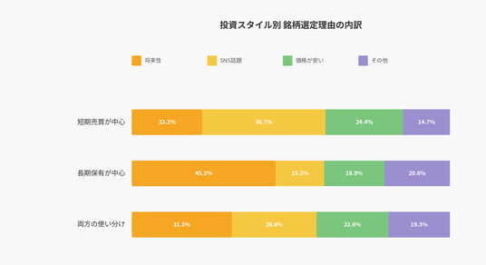 対照的に長期保有を前提とする層では45.3%が将来性を重視しておりスタイルと判断軸が一致しています。
