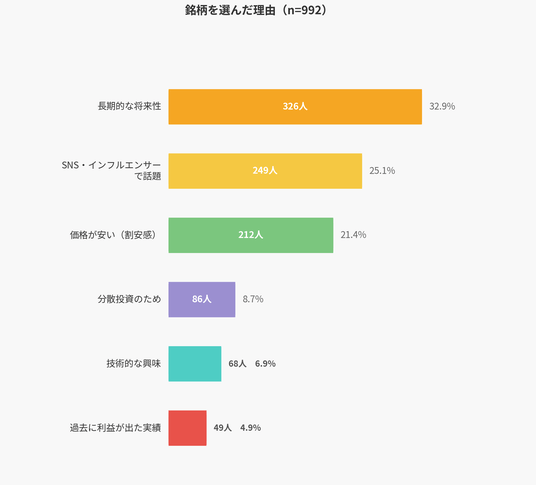 将来性という王道の理由とSNSや価格面といった感情的・直感的な理由が市場を二分している現状が示されました。