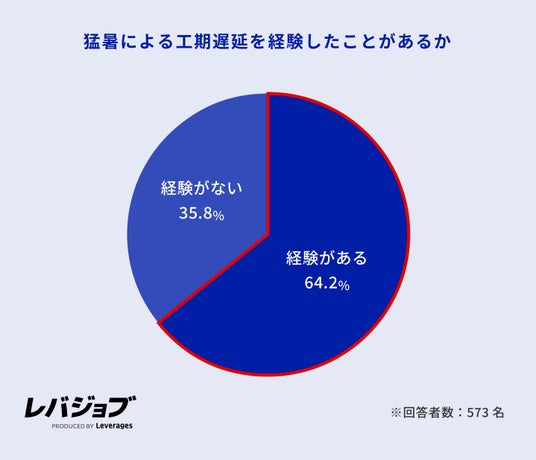 猛暑の影響による工期遅延については、約6割の施工管理職が「経験がある(64.2%)」と回答しました。