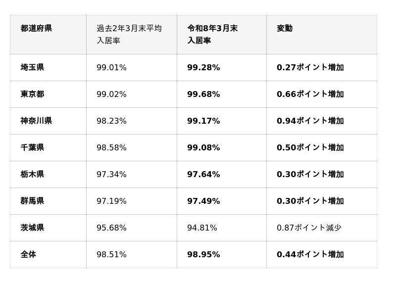 1都3県で入居率99%超え 北関東では定住傾向が見られ過去平均を上回る