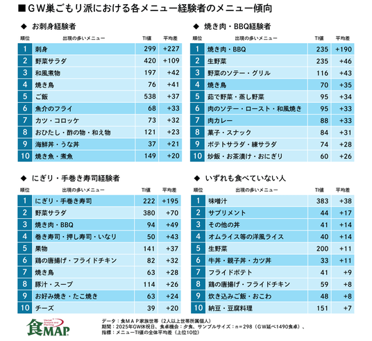 お刺身経験者は、GW中にアジフライなどの魚介のフライや海鮮丼・うな丼、焼き魚・煮魚などの魚介メニューを全体よりも多く食べていたことを示しています。同様に、焼き肉・BBQ経験者は焼鳥の他、チキンソテーやローストポーク、生姜焼きなどの肉の焼きものや、肉カレーなどの肉料理を好んでいるようです。にぎり・手巻き寿司経験者は巻き寿司・押し寿司のほか、焼き肉・BBQやお好み焼き・たこ焼きなどパーティーメニューが目立ちます。