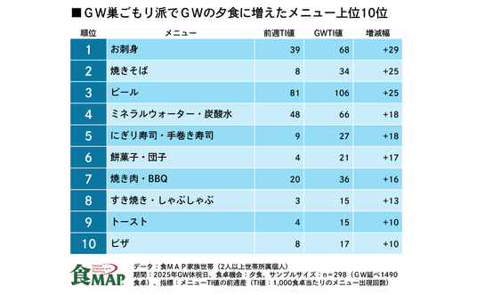 図表2は、2025年GWの休み中、毎日家で晩ごはんを食べていた人(以降、GW巣ごもり派)を対象に、前週よりも出現が増えた夕食メニュー(上位10位)を表しています。GWらしく、お刺身やお寿司、焼き肉などのハレメニューが増加しているほか、焼きそばやピザなども増えています。
