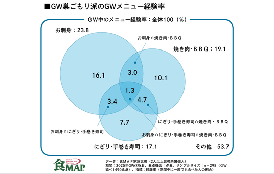 お刺身を一度でも食べた人は全体の23.8%と多く、同様に焼き肉・BBQは19.1%、にぎり寿司・手巻き寿司は17.1%となりました。3メニューいずれかを経験しているのは全体の46.3%と約半数、2メニュー利用は11.1%、3メニュー全てとなると1.3%と少数でした。お刺身や焼き肉、お寿司などいずれもGWの定番メニューではありますが、ユーザーは分かれているようです。