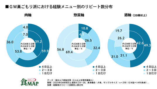 一方で、いずれのメニューも食べていなかった人に注目すると、丼やオムライスなど洋風ライス、炊き込みご飯など一品型の主食メニュー、さらにサプリメントによる栄養摂取も取り入れていました。GWのハレ感とは異なる、タイパやコスパを重視した合理的なメニュー選択といえそうです。