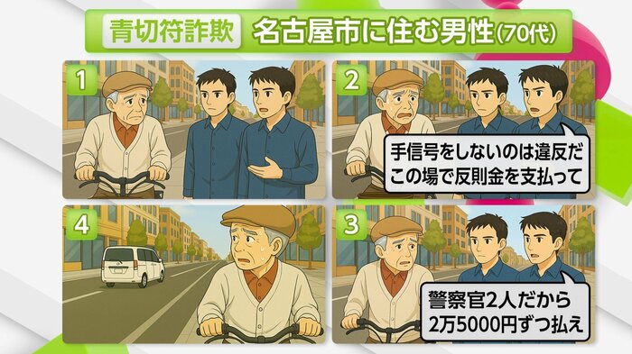 4月17日、「歩行者がいるのに手信号しないのは違反だ」と名古屋市内の歩道を自転車で走行していた70代の男性を呼び止めたのは警察官を名乗る2人組の男。