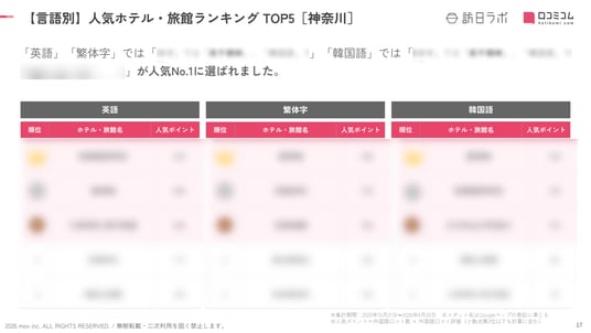 業界最大級のインバウンドビジネスメディア「訪日ラボ」及び 店舗向け集客一元化プラットフォーム「口コミコム」を運営する株式会社mov(代表取締役:渡邊 誠、本社:東京都渋谷区、以下mov)は、神奈川県のホテル・旅館に寄せられた最新の口コミデータから、独自の『インバウンド人気ホテル・旅館ランキング』を発表しました。