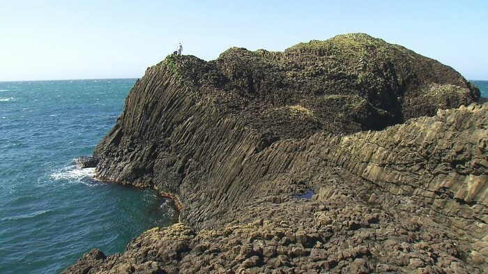 越前松島の地形は、約1200万年前の火山活動によって形成された。溶岩が冷えて固まる際に柱状に割れ目ができる「柱状節理」。それを間近で見ることができる。ゴツゴツとした岩肌は荒々しくも美しく、自然が長い歳月をかけて描いた造形美だ。