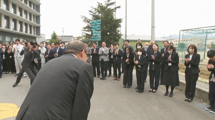 4月12日の黒部市長選挙で現職との一騎打ちを制した上坂展弘新市長は、23日、市役所に初登庁した。市役所前には多くの支援者や職員が集まり、花束を受け取った上坂市長を出迎えた。