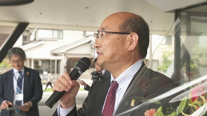 黒部市長選挙で初当選した上坂展弘市長が4月23日、初登庁した。花束を手に職員や支援者の出迎えを受けた新市長は、就任式で「相手を尊重すること」を職員に求め、前市長のパワハラ疑惑を調査する第三者委員会の早急な設置に向けた考えを示した。