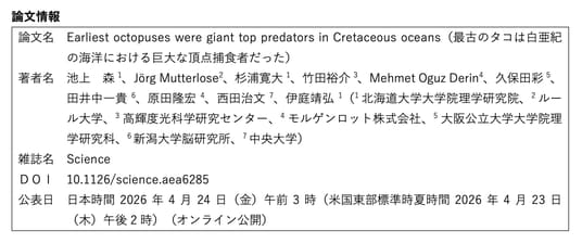 北海道大学大学院理学研究院の伊庭靖弘准教授、同大学大学院理学研究院の池上 森学術研究員、同大学大学院理学院修士課程の杉浦寛大氏、ルール大学のヨーク・ムッターローゼ教授、高輝度光科学研究センターの竹田裕介研究員、モルゲンロット株式会社のメフメト・オグズ・デリン氏、同社の原田隆宏博士、大阪公立大学大学院理学研究科の久保田彩講師、新潟大学脳研究所の田井中一貴教授、中央大学の西田治文名誉教授の研究グループは、大規模3Dデータを可視化可能にするAIモデルを開発し、約1億~7,200万年前(白亜紀後期)のタコ類の顎化石を解析することで、体サイズ及び生態を詳細に復元しました。
