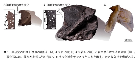 顎化石表面には大きな欠けや傷などの摩耗痕があり、その積み重ねで失われた部分は顎の全長の10%近くに達することが分かりました(図1)。さらに、噛む部分周辺に、強い負荷により形成された多数のヒビが発見されました。これらの痕跡は、白亜紀のタコが非常に強い噛む力を持ち、硬い殻や骨を持つ貝やアンモナイト、魚などを活発に捕食していたことを示唆します。また、この摩耗の度合は左右で大きく異なることが示され、彼らに高度な知性を示唆する「利き手」という個性があったことが明らかになりました。以上の発見は、最初期のタコが、過去約4億年間の海洋において、頂点捕食者へと進化した唯一の無脊椎動物であることを示します。