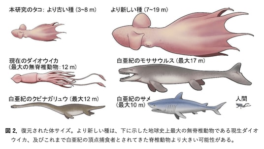 - 1億年前のタコが、最大19 mに達し、高度な知性を持つ獰猛(どうもう)な肉食動物であったことを解明。