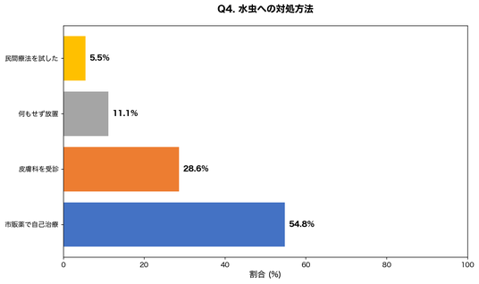 半数以上が市販薬による自己治療を選択しており、皮膚科受診は3割に満たない状況です。水虫は適切な診断と治療期間の確保が重要であり、自己判断での治療は完治を難しくする要因となります。