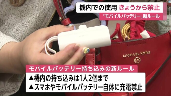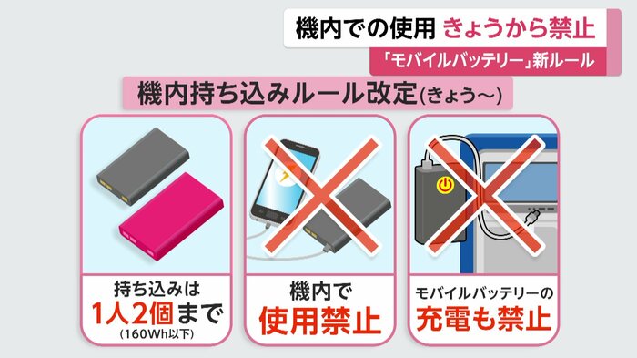 航空機内でモバイルバッテリーの発火事例が相次いだことを受け、24日から新ルールが始まり、機内への持ち込みは1人2個まで、モバイルバッテリーを使ってスマートフォンなどに充電することやモバイルバッテリー自体を充電することも禁止される。