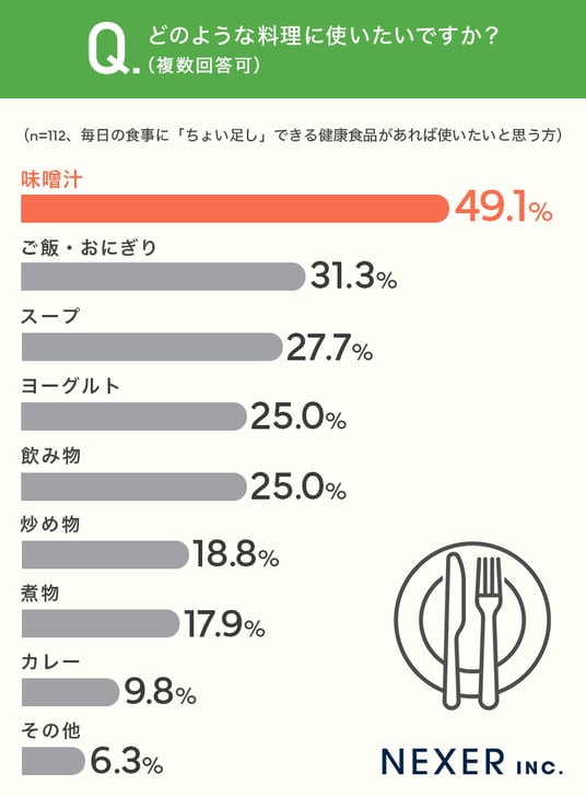 続いて、毎日の食事に「ちょい足し」できる健康食品があれば使いたいと思う方に、どのような料理に使いたいか聞いてみました。