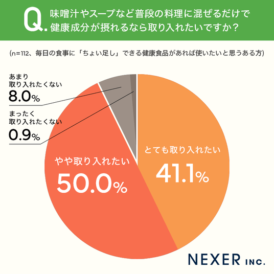 続いて、毎日の食事に「ちょい足し」できる健康食品があれば使いたいと思う方に、味噌汁やスープなど普段の料理に混ぜるだけで健康成分が摂れるなら取り入れたいかを聞いてみました。
