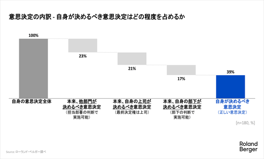 - 自身が関与する意思決定のうち、「本来自身が決めるべき」ものは4割に満たず、残り6割は他部門・上司・部下が決めるべき案件への“巻き込まれ”です