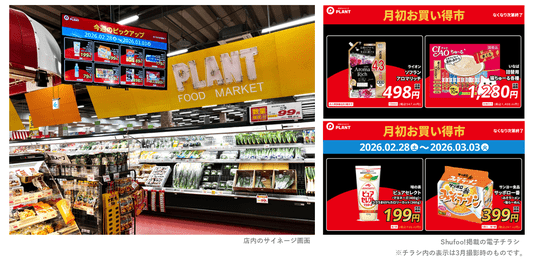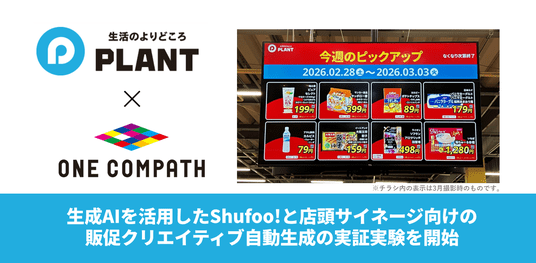 TOPPANグループの株式会社ONE COMPATH(ワン・コンパス 本社:東京都港区/代表取締役社長 CEO :早川礼)は、株式会社PLANT(プラント 本社:福井県坂井市/代表取締役社長:三ッ田 泰二)協力のもと、生成AIを活用して電子チラシサービス「Shufoo!(シュフー)」および店頭デジタルサイネージ向けの販促クリエイティブを自動生成し、配信する実証実験を行いました。 本実験は、PLANT 川北店(石川県)にて実施され、クリエイティブ制作の効率化のほか、一部のコンテンツにて通常チラシよりも若年層の閲覧数増加の傾向が確認されました。