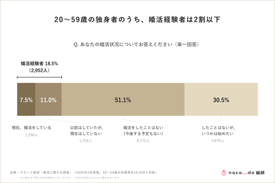 ナコード総研が創設に先立ち実施した調査(2026年4月、20~59歳の未婚男女16,000人対象)によると、婚活を経験したことがある人は、全体の2割以下にとどまっています。一方で、「婚活をしたことはないが、いつかは始めたい」と答えた人は30.5%。婚活関心層が、婚活経験者よりも多いことが伺えます。