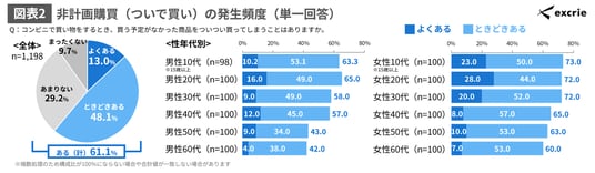 非計画購買(ついで買い)をする頻度を聞いたところ、61.1%が「ある(よくある+ときどきある)」と回答しました。性年代別では、女性10代が73.0%、女性20代・30代が共に72.0%と、若年女性層でついで買いをする割合が特に高くなっています。(図表2)