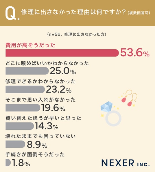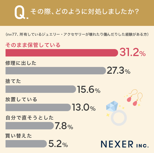 今回の調査では、ジュエリー・アクセサリー所有者の半数が「壊れたり傷んだりした経験がある」と回答した一方、そのうち修理に出した方は3割にも届かないという結果になりました。