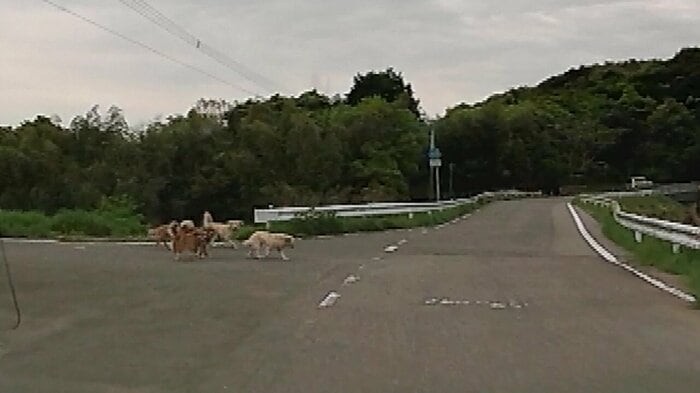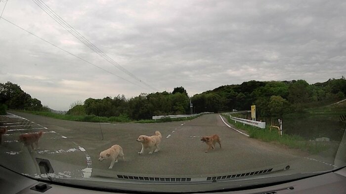 5匹のイヌが突如として道路に出現。イヌは道路の真ん中にとどまり、中には路上で座り込むイヌも。車は約40秒間停止。しばらくするとイヌは立ち去った。飼い犬なのか野良犬なのかは不明だという。