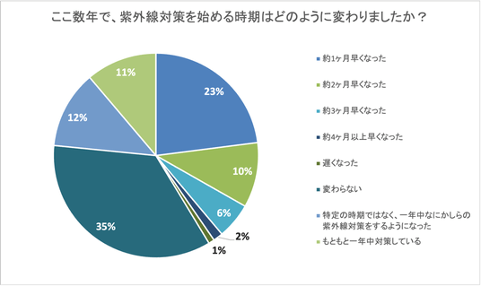 紫外線対策については、約4割が「ここ数年で紫外線対策の開始時期が早くなった」と回答しており、対策の前倒しや通年化が進んでいます。