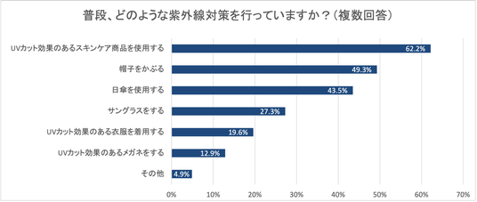 一方で、具体的な対策内容を見ると、「UVカット効果のあるスキンケア商品」(62.2%)や「帽子」(49.3%)、「日傘」(43.5%)が上位に並ぶのに対し、「サングラス」(27.3%)、「UVカット効果のあるメガネ」(12.9%)は低水準にとどまりました。