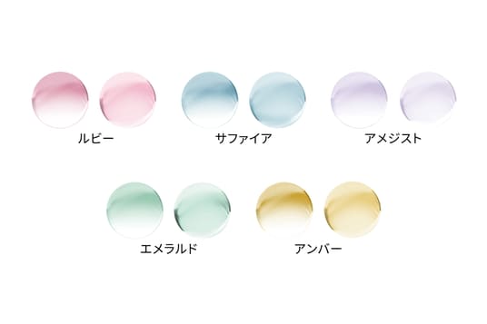 カラーは、グラディエントとウォッシュの2タイプに、ルビー、アンバー、サファイア、アメジスト、エメラルドの全5色を展開。好みのスタイルやシーンに合わせた選択が可能です。