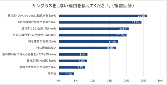 サングラスを使用しない理由としては、「メガネの掛け替えが面倒」(24.4%)や「持ち運びが面倒」(17.5%)、「室内外で外すのが手間」(7.8%)など、使いにくさに関する回答が多くを占めました。これらの結果から、サングラスを取り入れられにくい要因として、使いにくさに関する要素が最も大きいことがうかがえます。加えて、「見た目・ファッション的に抵抗がある」(26.1%)や「度付きでないと見づらい」(20.6%)といった理由も挙がっており、機能面・心理面の両方でハードルが存在していることも明らかになりました。