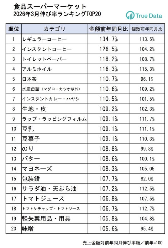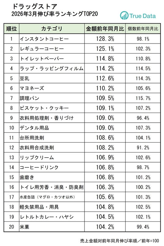 データに基づいた意思決定を支援する株式会社True Data(トゥルーデータ/本社:東京都港区、代表取締役社長:米倉 裕之、証券コード4416)は、当社の統計データをもとに、ドラッグストア、食品スーパーマーケットにおける2026年3月の売り上げ伸長カテゴリを発表します。