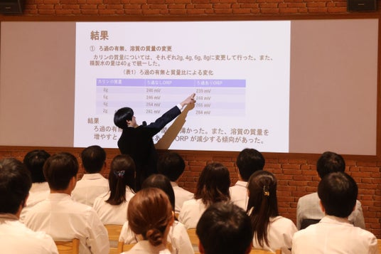 発表会では、ロッテの研究員が半年間伴走した中高生3チームが、独自の視点で「カリン」の可能性を発表しました。研究内容は多岐にわたり、地元山形の名産果物の酸化を防ぐ「還元剤」としての力を検証した発表や養殖魚の餌に活用して食味向上に挑んだ事例、タマネギの成分と組み合わせて環境に優しい「日焼け止め」を試作した研究など、斬新な成果が次々と披露されました。