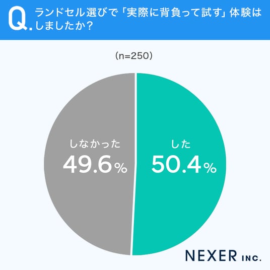 ■50.4%が、ランドセル選びで「実際に背負って試す」体験を「した」と回答