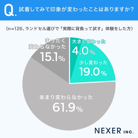 「あまり変わらなかった」が61.9%、「まったく変わらなかった」が15.1%と、約8割が大きな変化を感じなかったようです。一方で、「少し変わった」が19.0%、「大きく変わった」が4.0%と、合計23.0%が試着によって印象が変わったと回答しました。